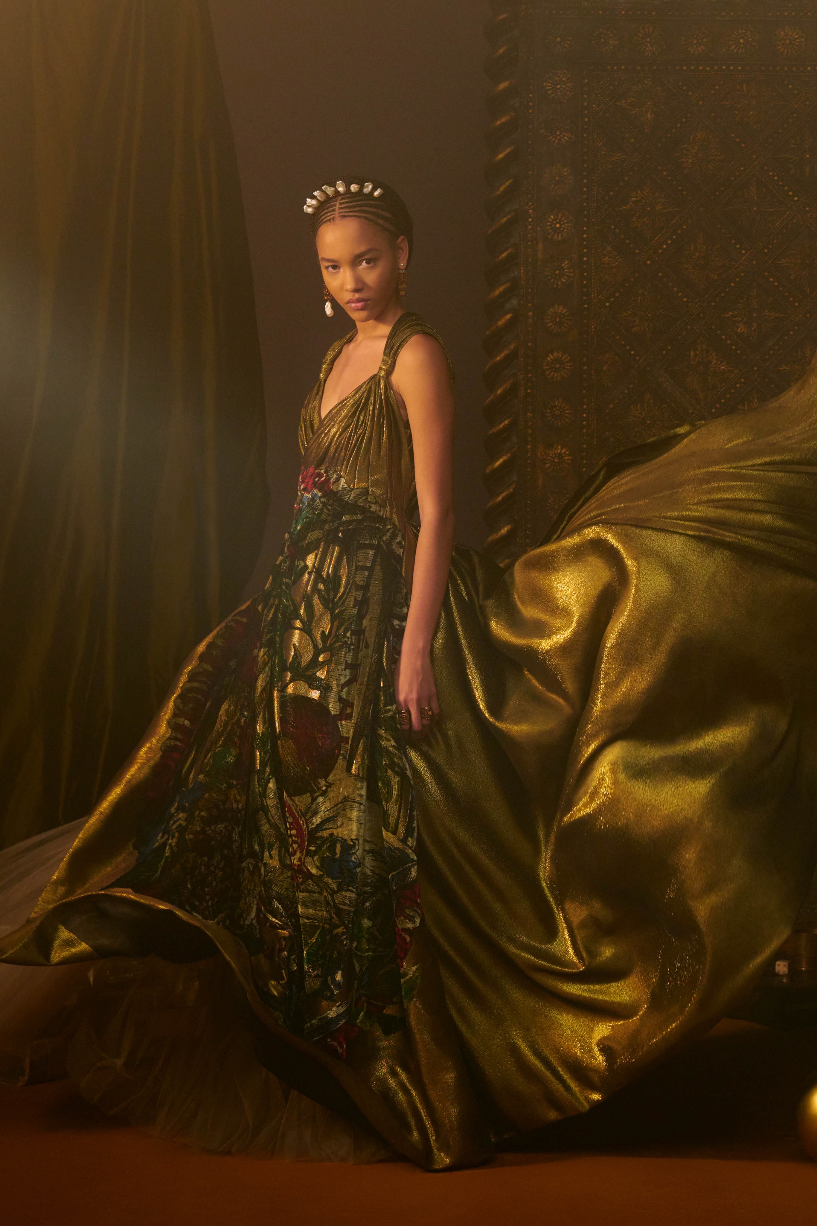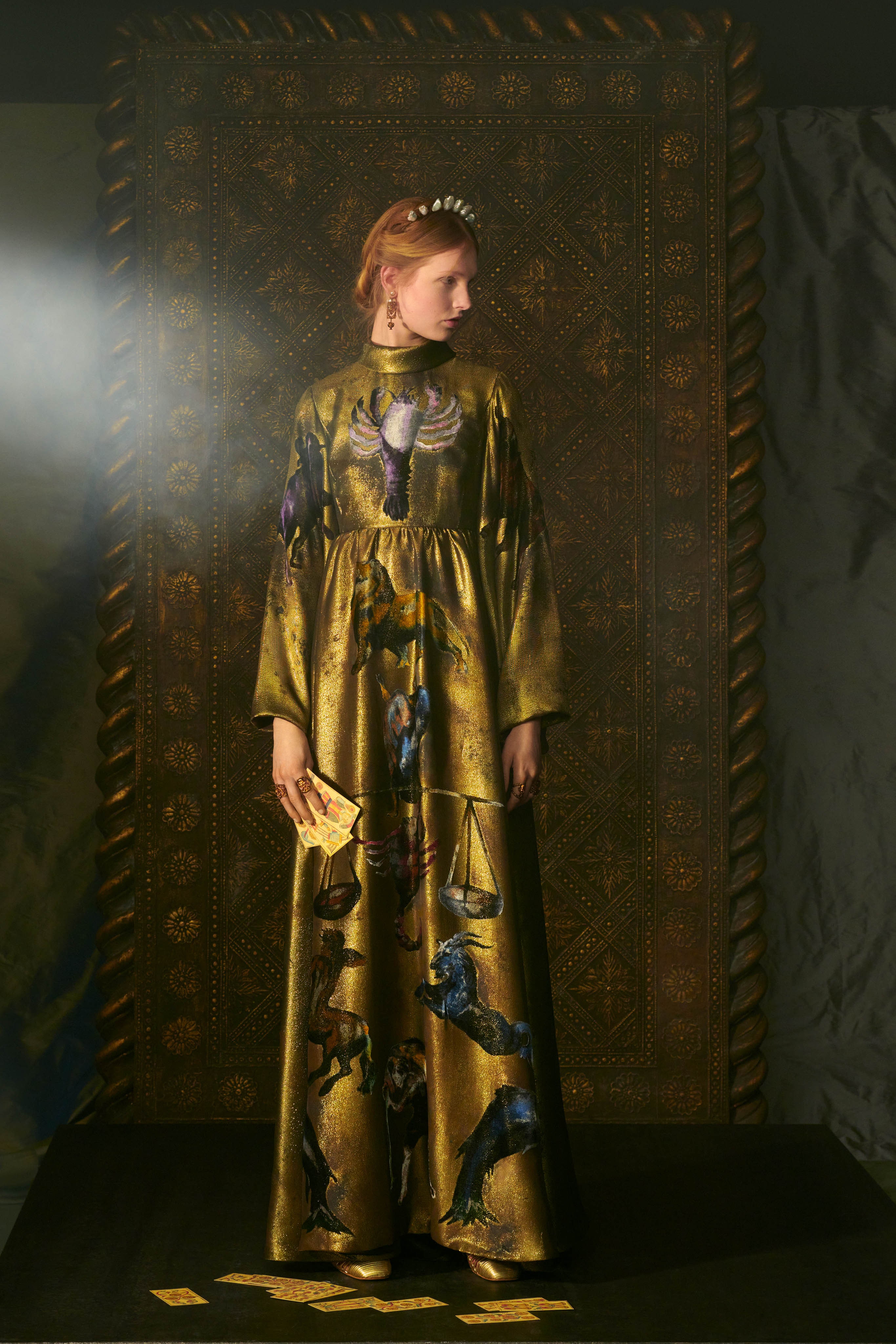 一个值得注意的细节是,大部分长裙都有着非常高的腰线,这使得裙子在下身形成略微向前凸起的弧线,让衣服看起来更像是中世纪神职人员的穿着,搭配具有金属光泽的面料和多彩刺绣,凝厚的油画质感也随之被展现出来。