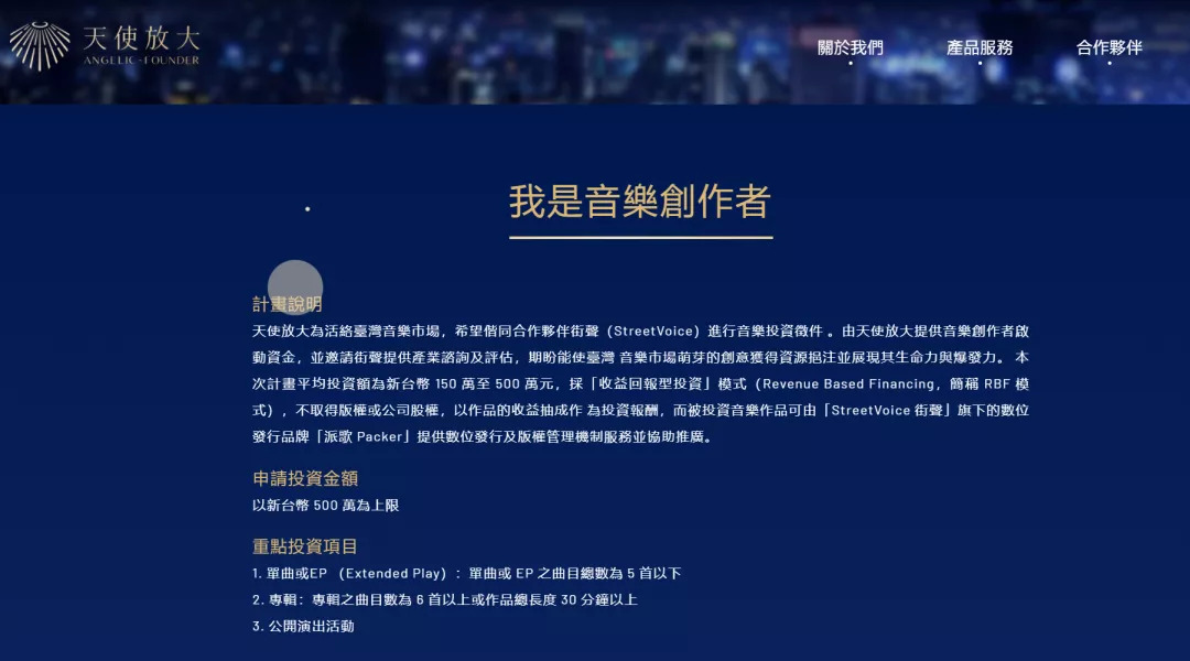 据悉,此次合作由街声提供产业咨询及评估,“天使放大”主导投资决策,将音乐制作与资金对接,全年收件评估,重点投资项目为音乐专辑、EP版权与演唱会,但不限其他音乐内容的可能形态。获得投资的音乐作品,可由“StreetVoice 街声”旗下的数位发行品牌派歌 Packer代理发行。