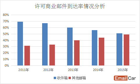 看了这么多家邮箱的浏览器端界面,大家应该明白了邮箱的一个基本态度。所以当邮件在垃圾箱中以后确实对用户阅读产生一定的影响。但从邮箱的角度希望收件箱中的邮件是对用户最有价值的,而这种价值的确定每家的标准也是不同的。来自第三方的数据统计最近5年的商业邮件到达情况统计来看,邮箱机构再变得更加严格。图6所示