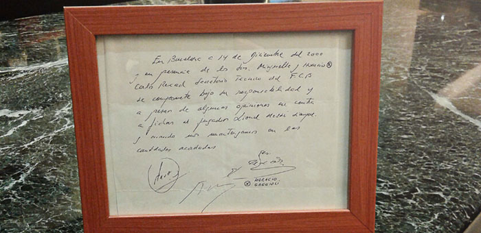 “我并非律师,但是如果梅西改变了心意,不想跟巴萨签约的话,我们就拿着这张纸巾去法庭,说因为梅西的代理人签了字,去说服法官这个13岁的小男孩归我们所有还是很困难的。这是一个很好的故事,不过真正签下梅西的人是弗朗西斯科·克洛萨。”