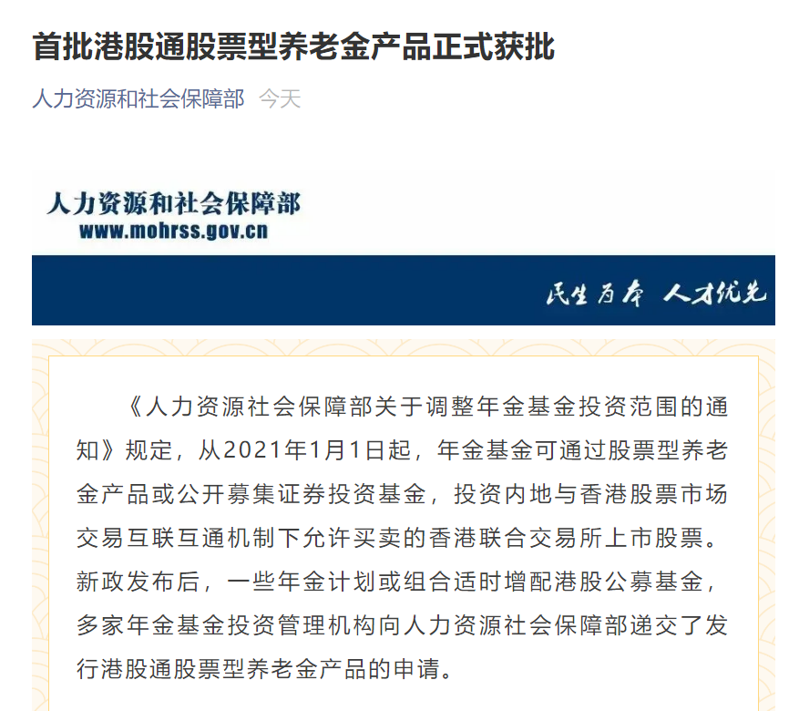 2020年12月30日,人力资源社会保障部发布关于调整年金基金投资范围的通知。通知称,1月1日起,年金基金财产可以进行境内投资和香港市场投资。香港市场投资指年金基金通过股票型养老金产品或公开募集证券投资基金,投资港股通标的股票。