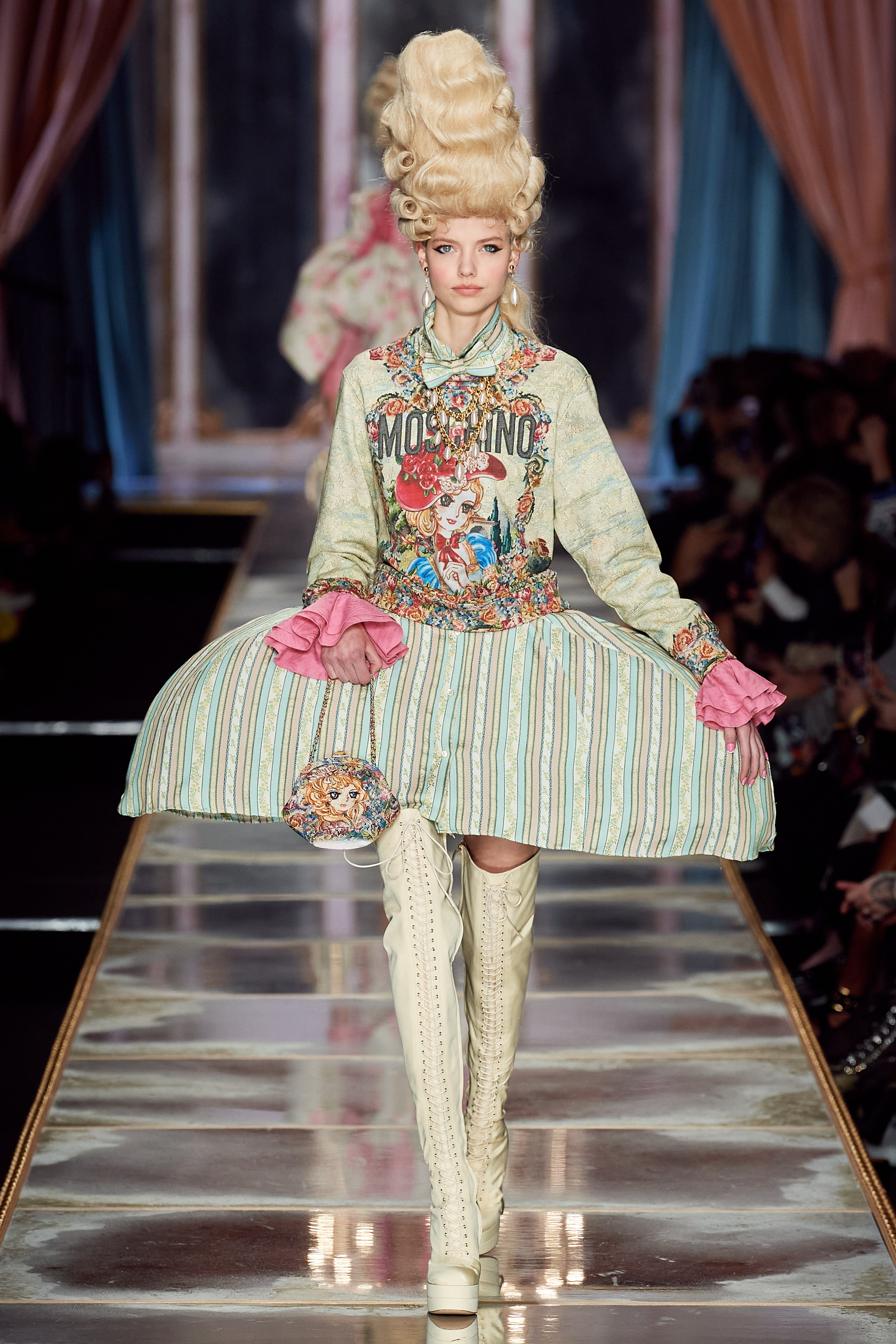 再夸张一点,去中古店找出Jeremy Scott过去几年为Moschino设计的各种麦当劳套装、海绵宝宝印花衫和以《豪门恩怨(Dynasty)》为灵感的单品,炖出最浓郁的美式风格穿搭,再搭配2020秋冬系列中的凡尔赛主题包袋,足不出门就已经环游世界。