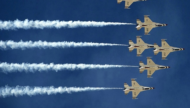 19. 2011年10月8日,新墨西哥州霍洛曼空军基地,雷鸟飞行队的F-16战隼在2011“解放遗产”航展上表演。