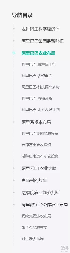 35斗系统梳理了阿里数字经济体在农业领域的布局,不仅可以看到阿里切入农业的完整时间线和里程碑事件,也可以看到其前后布局逻辑、布局方式的变化。