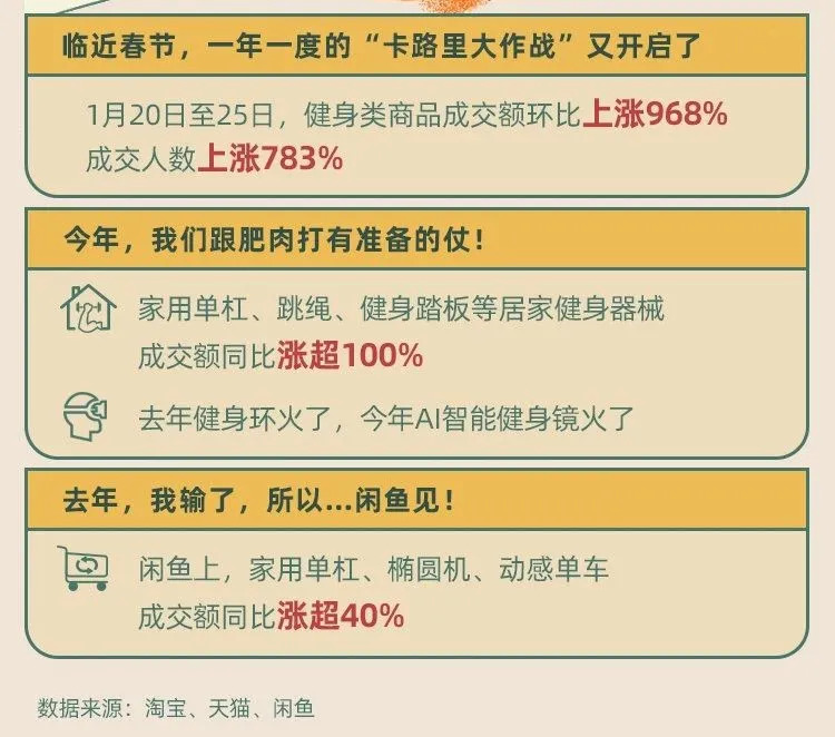 不过,资本对市场抱有乐观的根本原因,是中国消费者对健身产品持续高涨的热情。根据阿里巴巴的春节暖报显示,在春节假期前夕的1月20日-25日,健身类商品成交额环比上涨968%,成交人数上涨783%,家用单杠、跳绳、健身踏板等居家健身器材同比涨超100%,想要在国内爆火的AI智能健身镜,自然能够多分得一杯羹。