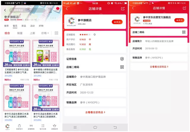 其中,参半天猫旗舰店的开店时间显示为2019年2月,经营方为小阔科技,目前该店铺的粉丝量已达到13.7万;参半在京东上则开设有参半京东自营官方旗舰店和参半旗舰店两家店铺,开店时间分别是2018年8月和2020年12月;值得一提的是,其在拼多多上销售的商品除了口腔类产品外,还包括了洗护产品。