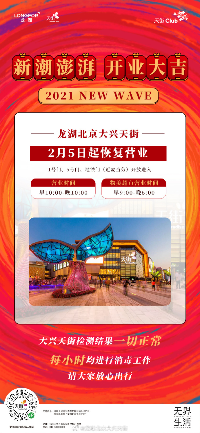 据@龙湖北京大兴天街 微博消息,2月5日起,龙湖北京大兴天街恢复营业,营业时间为早10:00-晚10:00,物美超市营业时间为早9:00-晚6:00。大兴天街检测结果一切正常,每小时均进行消毒工作。此前由于北京大兴区天宫院融汇小区新冠肺炎确诊病例曾到龙湖北京大兴天街商场停留,1月19日,龙湖北京大兴天街官方微博发布消息,宣布商场于当日15时起暂停营业,进行全面消杀。