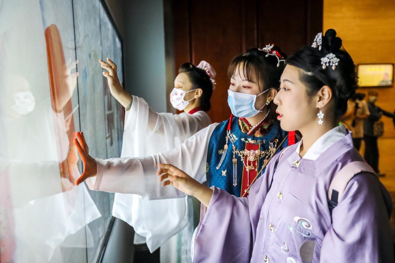 工作人员介绍,此次服饰文化展紧紧抓住了备受青年群体喜爱的中华传统服饰热潮,展览期间,不少青年人身穿汉服前来观展,与文物展开了一场跨越时空的触碰。