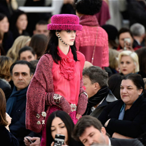 模特头戴的圆帽几乎是整场发布会标配,三分之二的造型都少不了这样一顶复古小礼帽。它们可以是斜纹软呢的,也可以是皮质的。视线下移十公分就会看到 本季曝光度极高的白色珍珠项链。不妨试想一下慈溪太后画像中层层叠叠、贵气逼人的珍珠项链,Chanel 在这方面毫不逊色,甚至带有高级定制的意味。