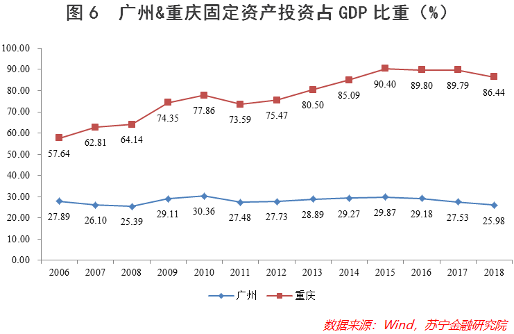 虽然广州和重庆的产业体系各具特点,但整体上看,重庆仍处在固定资产投资驱动的增长阶段,从“固定资产投资占GDP的比重”这一指标来看,2006年以来广州一直维持在25%~30%的区间内,而重庆却是一路走高,近几年更是高达90%左右(见图6)。不难发现,广州经济发展更多依托于产业的壮大,而不是一味地依靠“输血”,比重庆更具效率和质量。