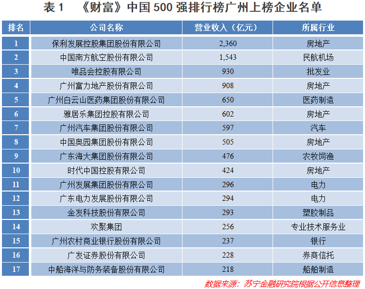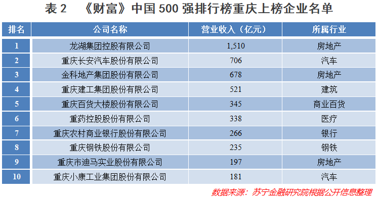 根据财富中文网发布的2020年的《财富》中国500强排行榜,广州共有17家企业进入榜单,重庆则有10家(见表1、表2)。其中营收规模达到千亿级别的企业,广州有2家,重庆有1家;营收规模达到500亿元以上的,广州有8家,重庆有4家。广州具备引领实力的巨头更多。