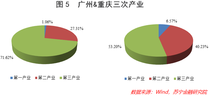 从数据上看,目前两个城市的产业结构均呈现出“三二一”态势,且第三产业(服务业)占GDP比重均已过半,不过广州的第三产业显然要比重庆发达得多,2019年占比高达71.62%,重庆则刚刚超过50%,其农业和二产所占份额皆高于广州(见图5),也反映出两座城市产业体系以及所处发展阶段的不同。