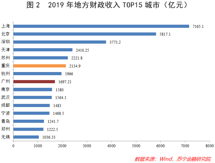 如果说GDP是城市的“面子”,那么财政收入就是城市的“里子”。数据显示,2019年广州的财政收入为1697.21亿元,排在全国第8位;重庆的财政收入为2134.9亿元,居于全国第6位(见图2)。