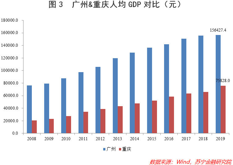 数据显示,在人均GDP方面,广州可以说是完胜重庆,二者在2019年的人均GDP数据分别为15.6万元和7.6万元,相差了一倍有余(见图3)。如果按照国际惯例,广州的人均GDP已经达到了初等发达国家水平(即人均GDP超过2万美元),经济发展颇具基础和底气,可是重庆显然还达不到这一标准。