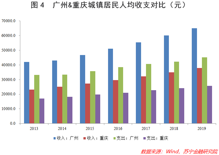 不过,严格意义上讲,人均GDP不能充分反映居民生活状况,用人均可支配收入与人均消费支出来衡量要更加贴切。与人均GDP相类似,在城镇居民人均可支配收入与人均支出两项指标上,广州同样大幅度领先于重庆(见图4),充分反映出广州居民更能享受到城市经济增长带来的红利,百姓生活水平更高,获得感也更强。