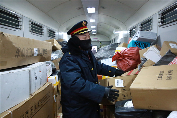 张瑜在整理货物。冬季物流不畅,居民网购的年货要靠“铁路公交”来运输(央广网发 哈尔滨局集团公司供图)