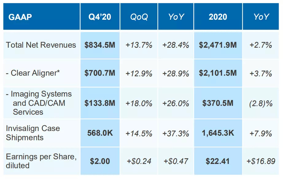 美东时间2月3日下午,全球隐形正畸赛道头部企业Align Technology爱齐科技(隐适美)发布了2020年度Q4财报。