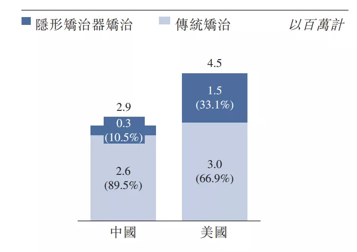 在儿童青少年市场方面,中国儿童青少年正畸治疗病例中约4.3%已使用隐形矫治器,相比之下,美国儿童青少年约15.9%已使用隐形矫治器。