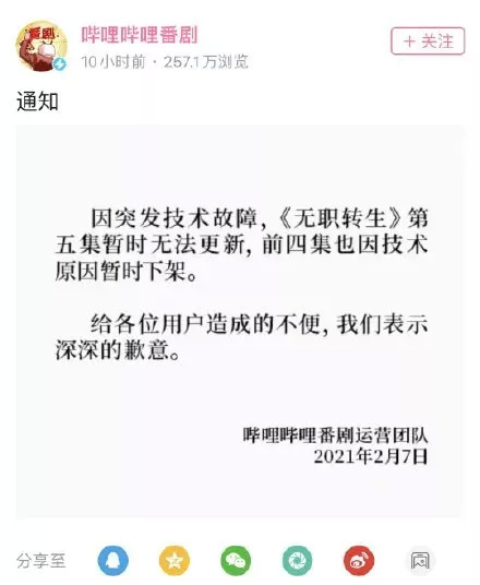 2月7日,“哔哩哔哩番剧”发布通知:因突发技术故障,《无职转生》第五集停止更新,前四集也将暂时下架。