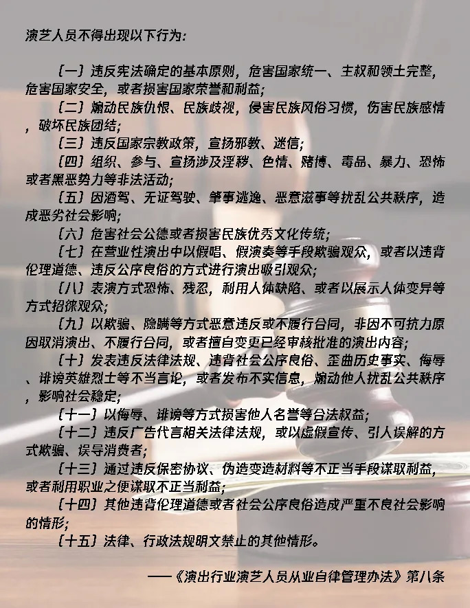 此次出台的《演出行业演艺人员从业自律管理办法》,共规定了十五种演艺人员不得出现的行为。经音乐先声查证,这十五种行为基本都能在其他法律法规中找到依据,这次作为重点被单独归纳总结,或许代表着有关部门将会针对这些违法违规行为加强监管与惩戒力度。