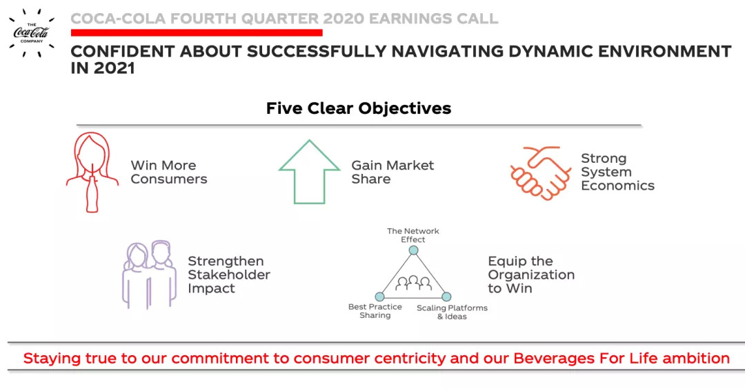 展望2021年,可口可乐公司预计,有机收入将实现高个位数的增长,可比每股收益将实现高个位数到低个位数的增长。