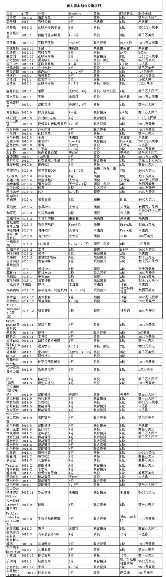 其中,k12(基础教育)中小学互动在线作业平台一起作业网,顺为资本共参与了其A、B、C、D四轮投资。而爱屋吉屋、星空琴行、阿姨帮、耶客网络,是目前顺为资本参与过三轮投资的4个项目。其中凡客、聚美优品等移动电子商务服务提供商耶客网络,在转型私厨后的项目烧饭饭已经关闭。