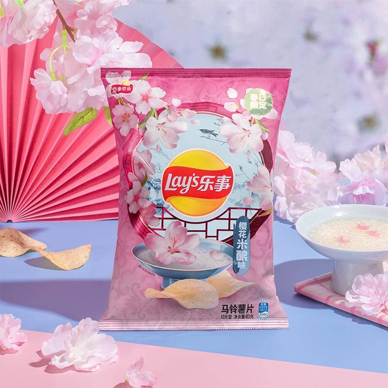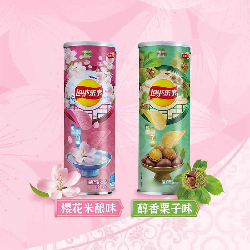 樱花配米酿是什么味道?如果你已经尝腻了常规的樱花味道,这款樱花米酿味乐事薯片或许可以满足你猎奇刁钻的味觉。此外,和乐事樱花限定口味一同推出的,还有生津杨梅味以及醇香栗子味薯片。