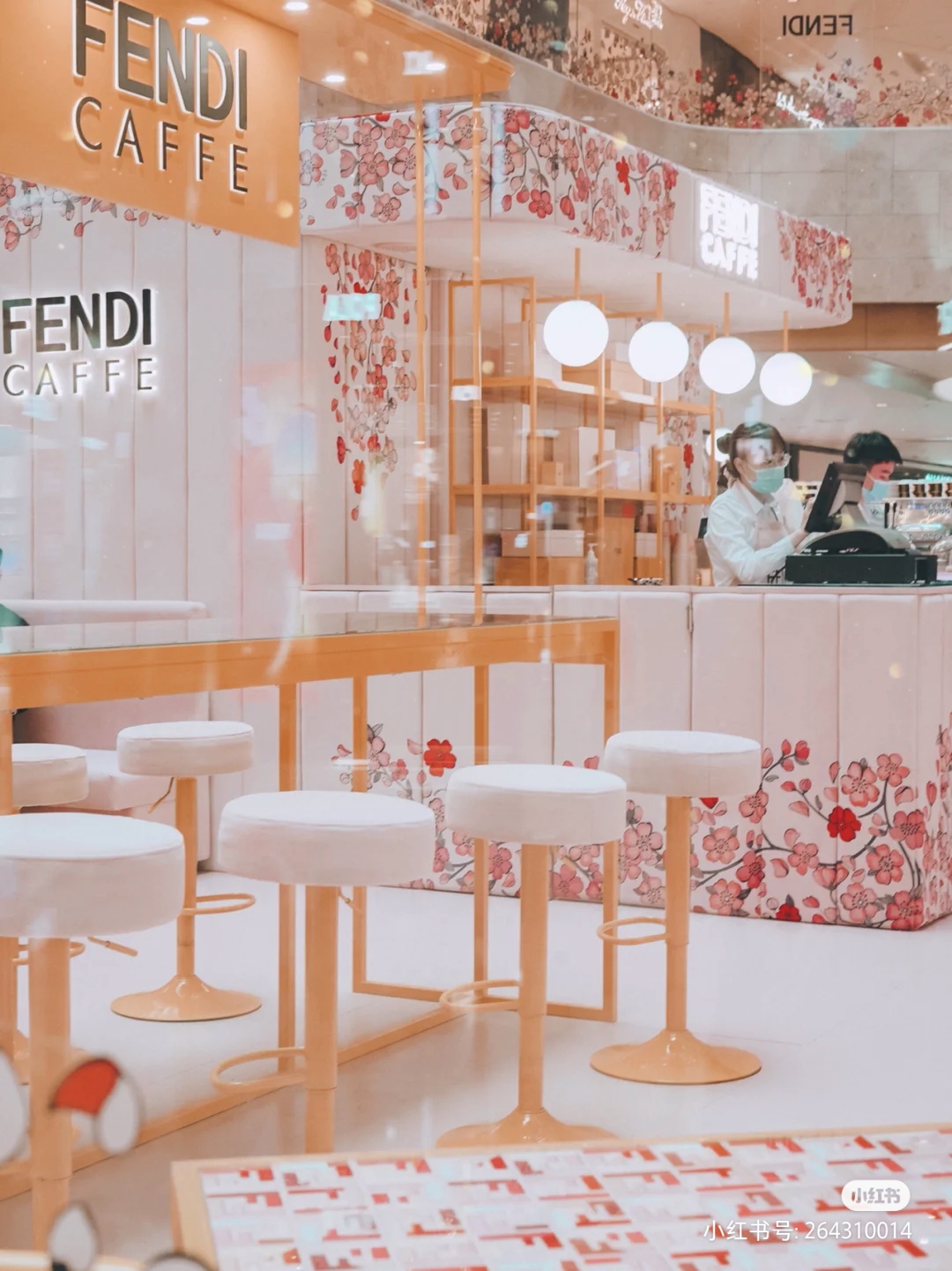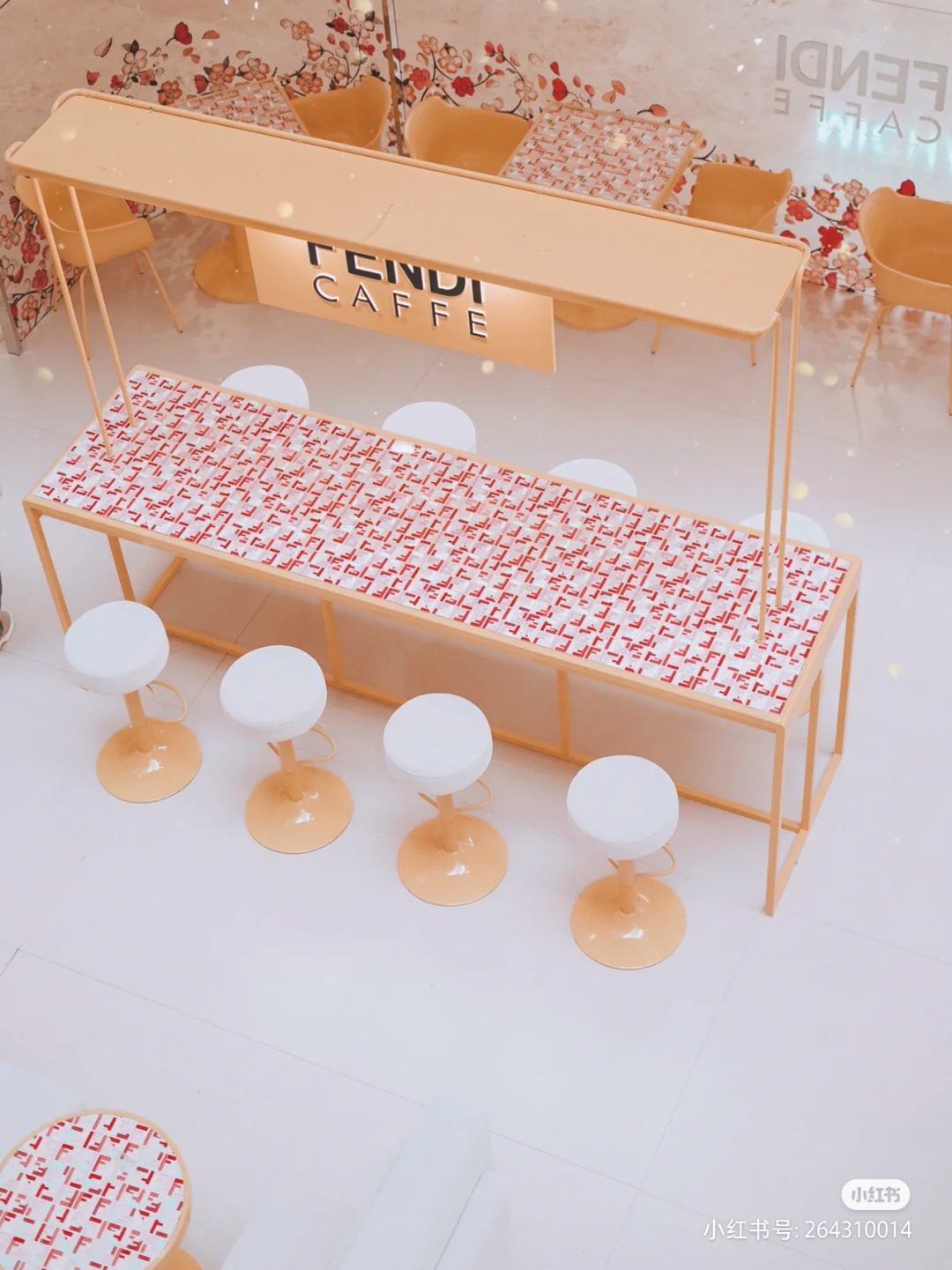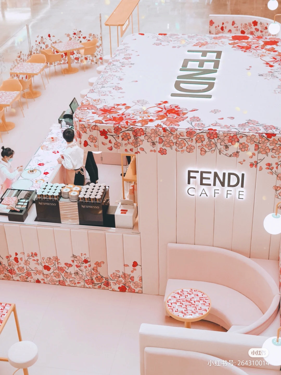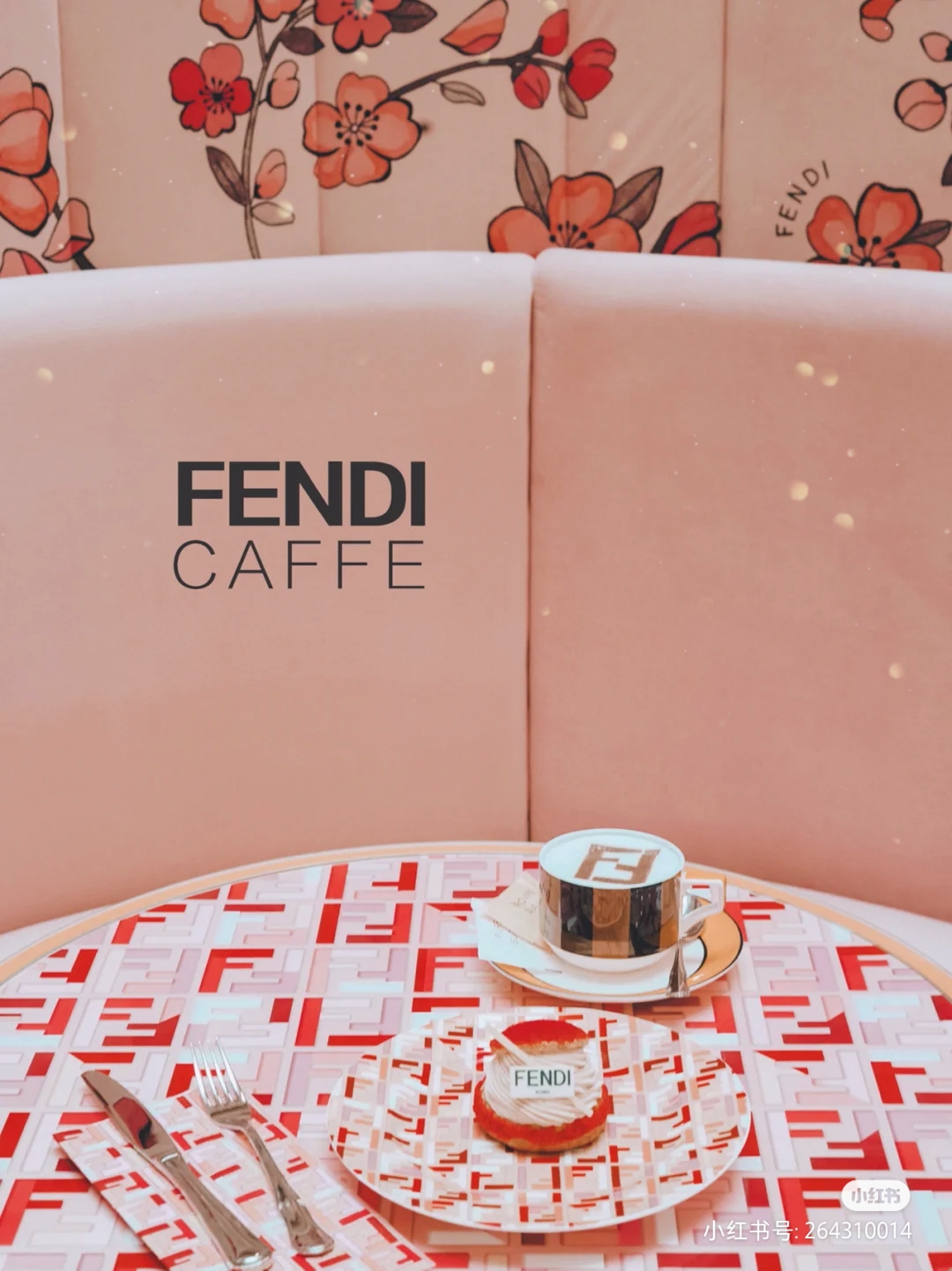 印上樱花图案的淡粉色沙发将门店围成一圈,店内的餐桌及餐盘也铺满经典的F标识和“FENDI 黄”。店内主打饮品包括拿铁、卡布奇诺、美式等常规咖啡和伯爵茶、薄荷茶等。其中咖啡拉花还是FENDI的双F标识。甜品则包含多款慕斯、芝士蛋糕及水果塔等。