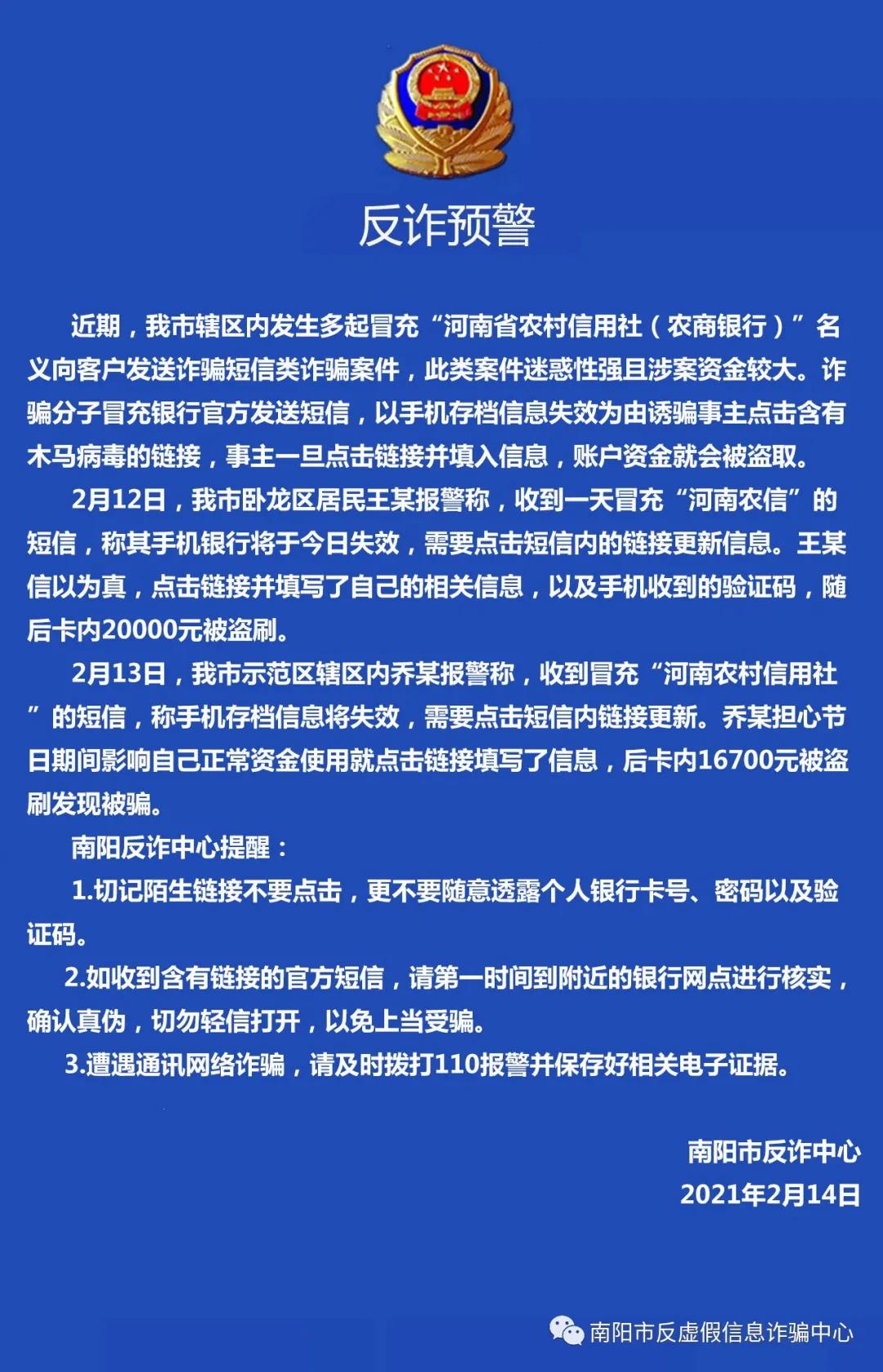 2月13日,南阳市示范区辖区内乔某报警称,收到冒充“河南农村信用社的短信,称手机存档信息将失效,需要点击短信内链接更新。乔某担心节日期间影响自己正常资金使用就点击链接填写了信息,后卡内16700元被盗刷发现被骗。