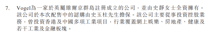 比如,2014年12月19日,海通证券(6837.HK)宣布定向配售约19.17亿新H股,认购价为15.62港元/股。其中第三大增持机构VogelHolding GroupLimited(简称:“Vogel”),注册于英属维京群岛,正是由史静全资持有,认购2.48亿股,总价为38.74亿港元。