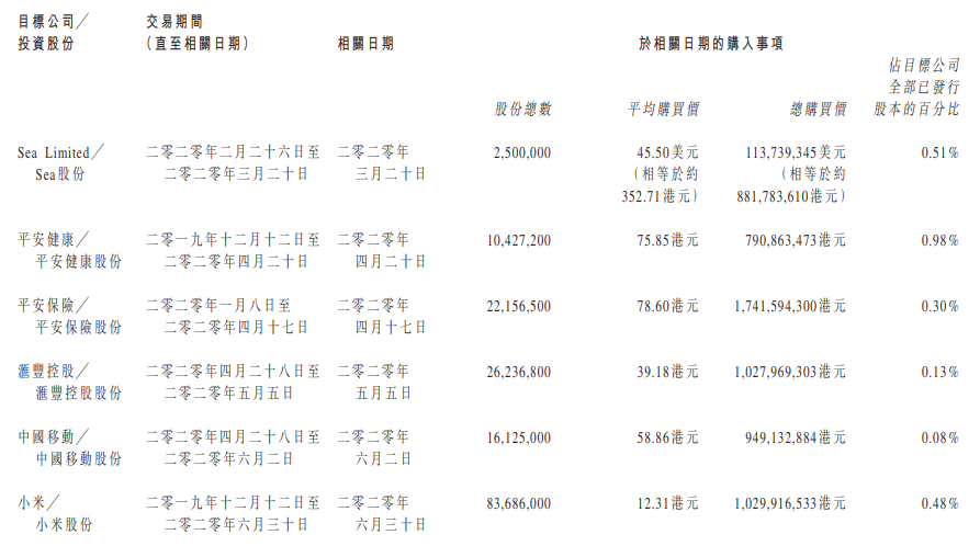 投资标的:小米、中国移动等