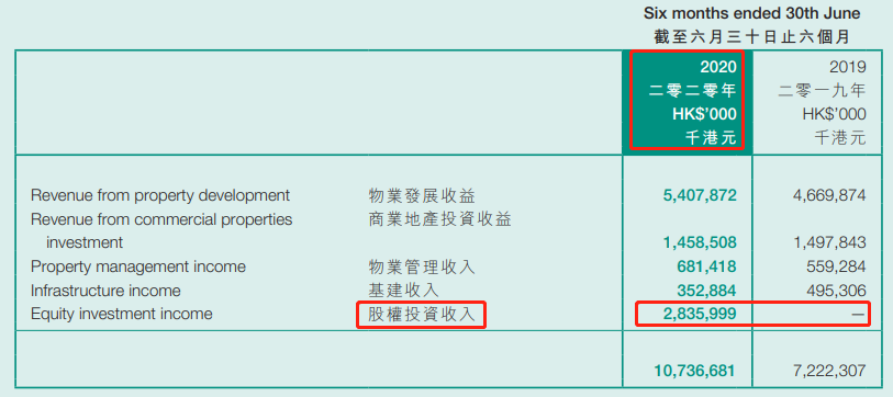 近年来,合生创展负债压力较大,销售业绩表现也差强人意,不过自朱桔榕接班一年以来,其股权投资倒是风生水起。财报显示,2020年上半年,合生创展收入突破107亿港币,较去年同期的72亿港币大幅增加近50%,而业绩增收几乎都来源于2020年来新增的“股权投资收入”。