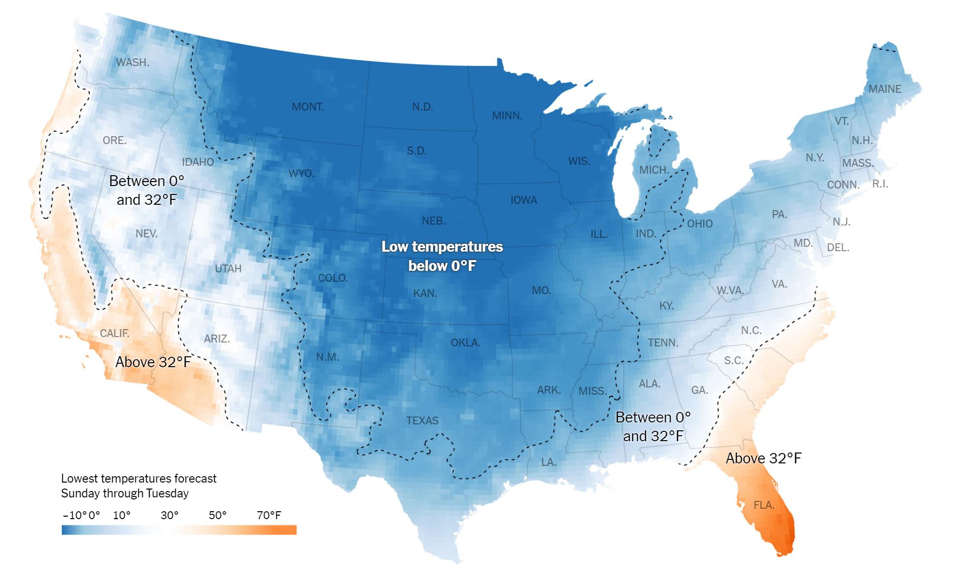 据《纽约时报》报道,本轮寒潮已在美国造成23人死亡,主要受寒冷本身影响,或在躲避恶劣冰雪天气途中发生交通事故。