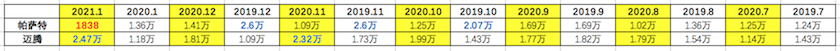 偏巧两者相加后的每月销售量都在3万左右。让人不得不怀疑,前两年执着于帕萨特的那群人,是不是都转而去买了迈腾。尤其是今年1月,当帕萨特销量仅为1838辆时,迈腾的销量达到了24681辆,同比增长89.6%。