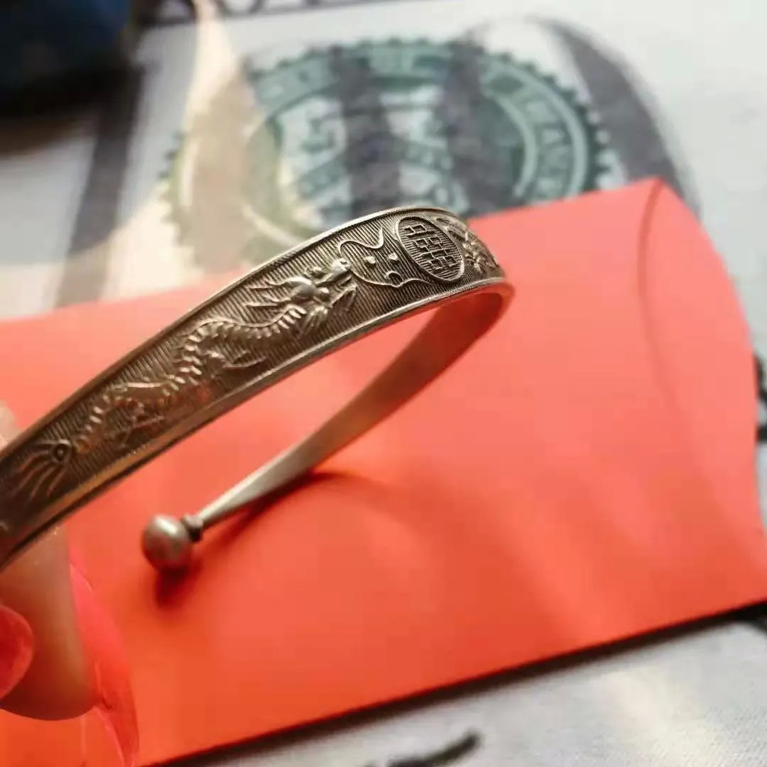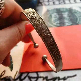 这个银镯纯手工打造,雕花精美,每一个纹理都承载着岁月的痕迹,镯内有足银二字,银子独有的光泽柔和而内敛。