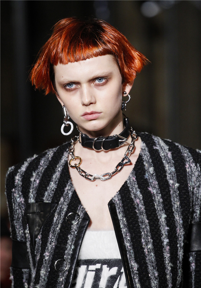 在纽约时装周期间——为期一月的马拉松式的时尚大秀刚刚拉开帷幕——新模特凯蒂·摩尔(Katie Moore)梳着与耶格一模一样的番茄红波波头走上T台。W杂志报道称,这款造型是全新的;妆发师Guido Palau在秀前将凯蒂·摩尔的及腰飘逸金色长发剪掉了。