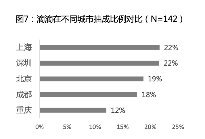 下面以滴滴为例,分析其在不同城市抽成策略是否一致。数据表明,滴滴在上海、深圳、北京和成都的抽成比例都在20%左右,而在重庆的抽成比例较低。