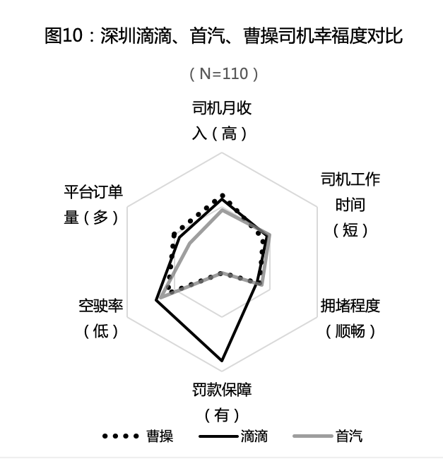 以深圳的数据为例,由于滴滴能为司机带来较高月收入、全面罚款保障和最低空驶率,该平台司机幸福度以5.5分居首;而首汽平台,鉴于其司机的工作时间最短,收入也更低,空驶率较高,因此在三个平台中以4.5分排在最后;曹操平台司机拥有相对较高收入、较短工作时间和较多订单的三大优势,以4.9分居中。
