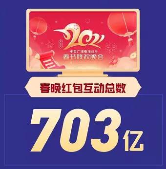 据抖音官方数据显示,除夕晚上,抖音一共发出去12亿元红包,红包总互动次数达到703亿。