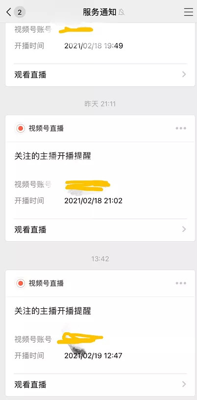 其中,视频号直播开播提醒的存在感极高。现在的微信版本下,只要关注的视频号开始直播,不管有没有预约这场直播,微信都会通过“服务通知”直接弹出主播开播提醒,并可以一键观看直播。