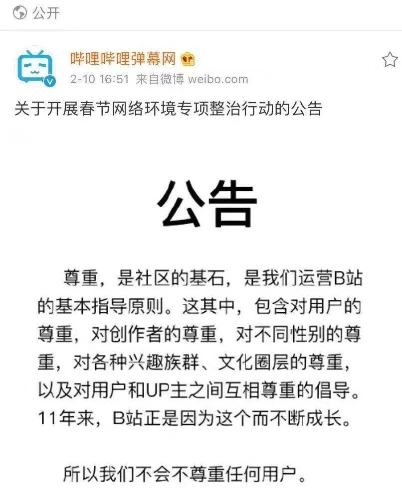 《无职转生》争议和封禁LexBurner事件让其站上舆论风口浪尖,并被质疑不尊重女性用户。2月10日,B站为此发布公告声明“不会不尊重任何用户”,宣布开展春节网络环境专项整治行动公告。