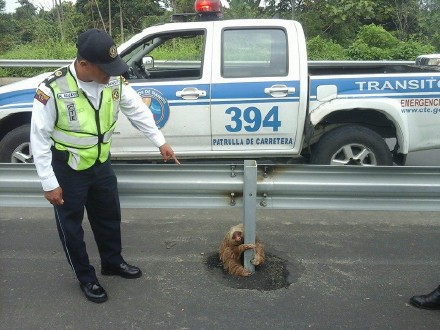 还记得前阵子网上流行的树懒被困在高速公路的图吗