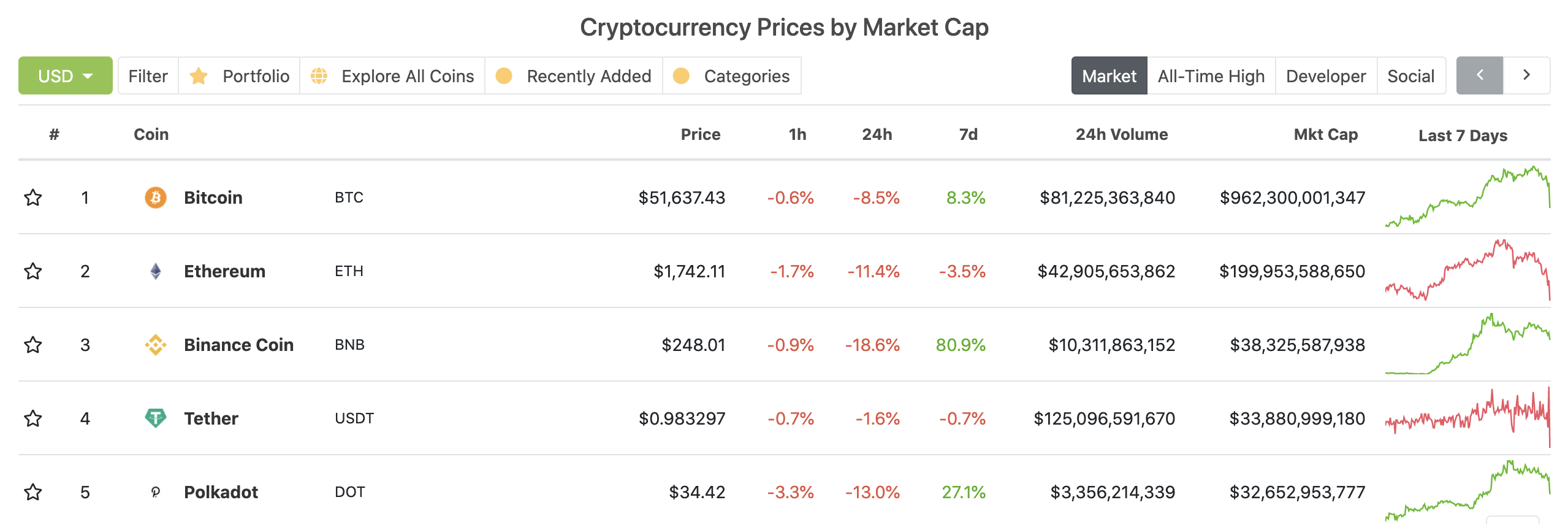 CoinGecko行情显示,截至北京时间22日22时42分左右,比特币报51637.43美元/枚,目前24小时跌幅达8.5%。此前一天,比特币突破58000美元/枚,续刷新高。