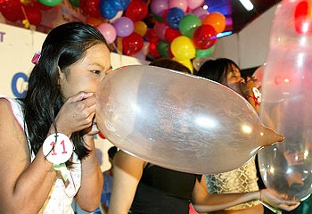 几十个年轻貌美的选手在现场比拼吹套套能力,评委同时会考验她们对艾滋病防治的知识了解。