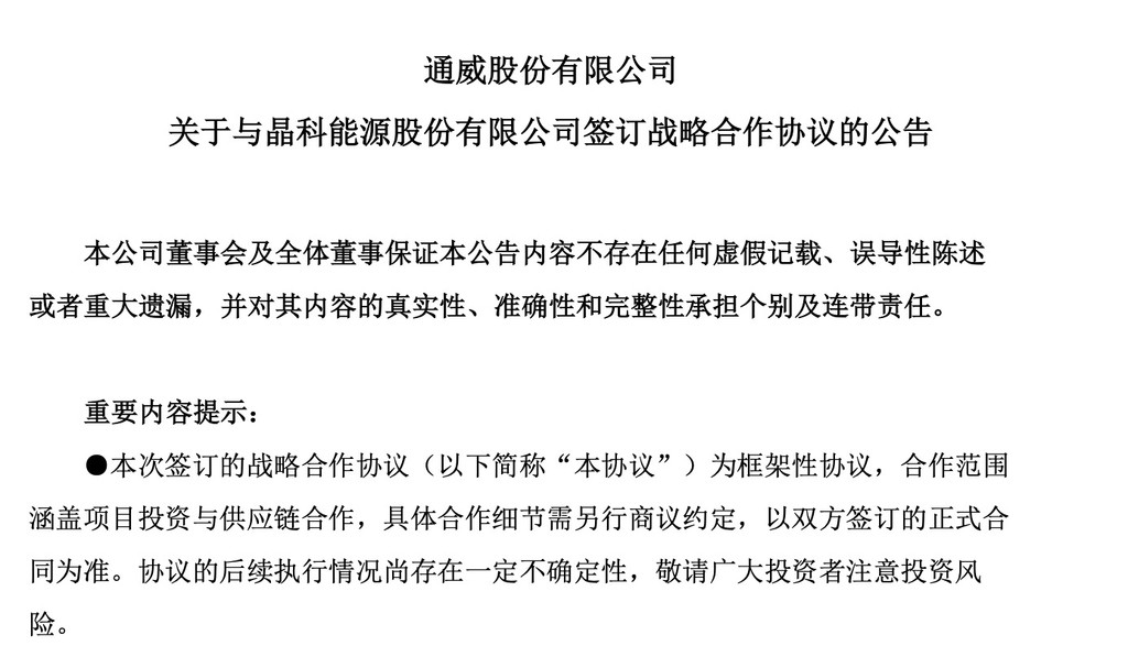 为确保硅料供给,通威股份也选择“抱团”,宣布拟与晶科能源签署《战略合作协议》。