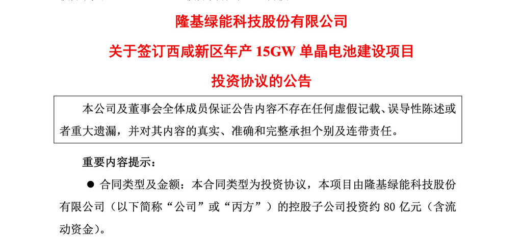 1月19日,隆基股份发布公告称,将投资80亿元在陕西西咸新区建设年产15GW单晶电池项目。
