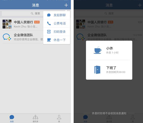 微信官方表示,此次企业微信有更纯粹的工作沟通环境,就是针对那些希望工作和生活可以适当分开的人群所开发的。给员工减负的初衷体现在了具体功能设计上。除了尽可能排除一切有可能的非工作干扰,企业微信还新添了“休息”功能,员工可以选择在休息的特定时间段不再接受信息,下班后,也进入工作免打扰模式。尽管这个功能的作用在实际使用中可能没那么理想,因为即使在非工作时间,许多人也会迫于社交压力而必须参与到工作群的实时讨论中去。但是至少它是一款在功能上允许你下班的聊天工具。