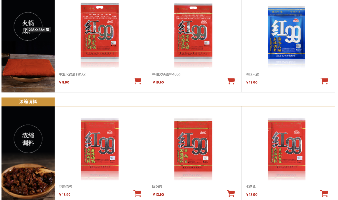 除了经营传统的重庆牛油、清油等口味火锅底料,同时业务还会延伸至复合味调料、酱料,以及火锅蘸料等,比如研发小龙虾、酸菜鱼、麻婆豆腐的厨房烹饪调料。产品品类、规格、价格都相差无几。