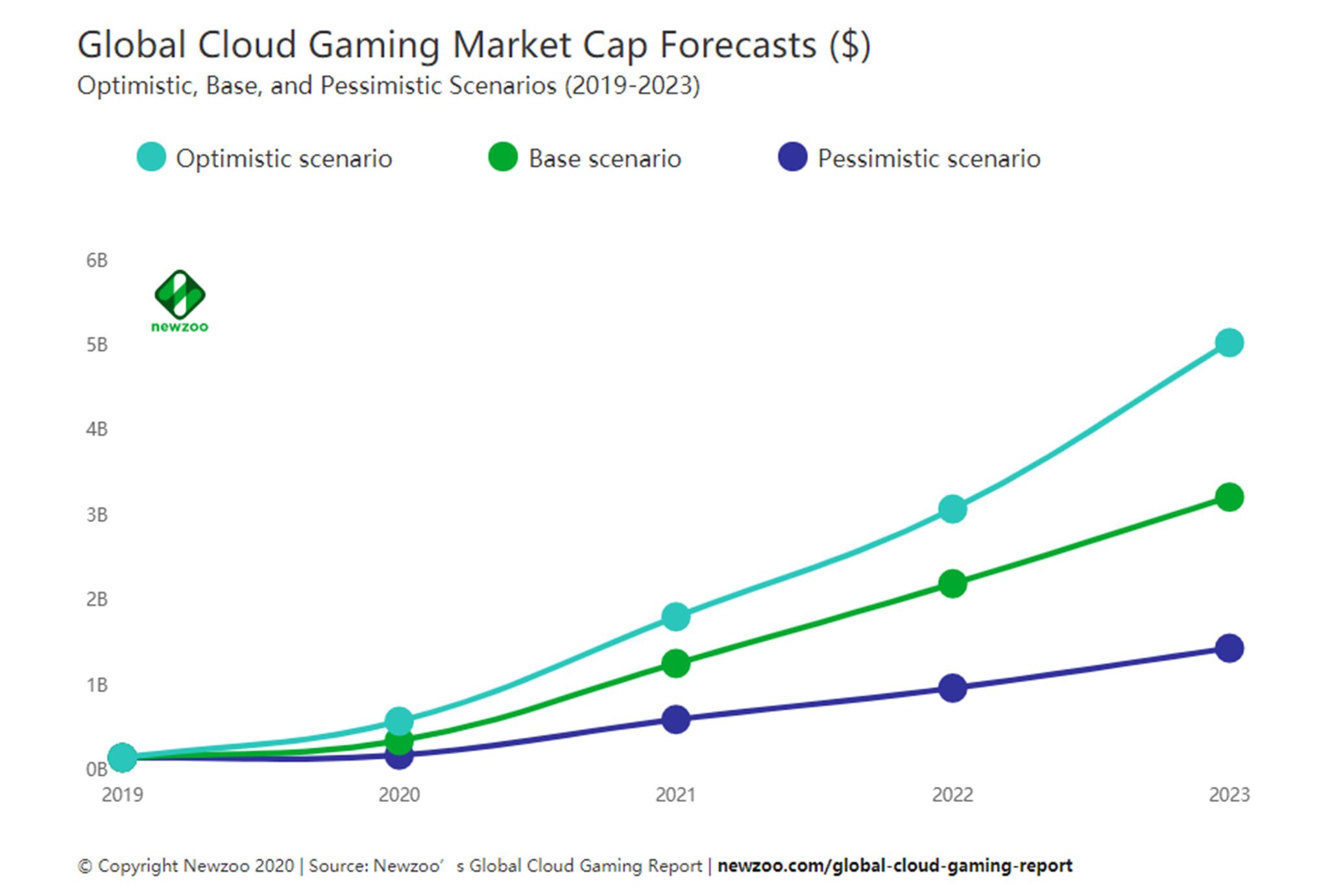 例如据Newzoo按照乐观、可能以及悲观的不同变量做的3种估算显示,乐观情况下,云游戏2020年收益达到4.59亿美元,市场规模不断攀升,直到2023年年底,云游戏市场规模或将达到51亿美元,复合年增长率为 123%;可能的情况下,2020年收益能达到3.56亿美元,市场规模增长较为平滑,直到2023年年底,云游戏市场规模或将达到32亿美元;悲观的情况下,考虑云游戏无法找到大量受众的可能性,2020年,云游戏收益为1.87 亿美元,到2023 年其收益为15亿美元。