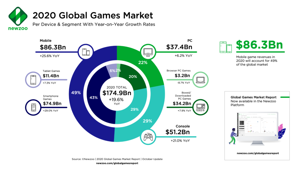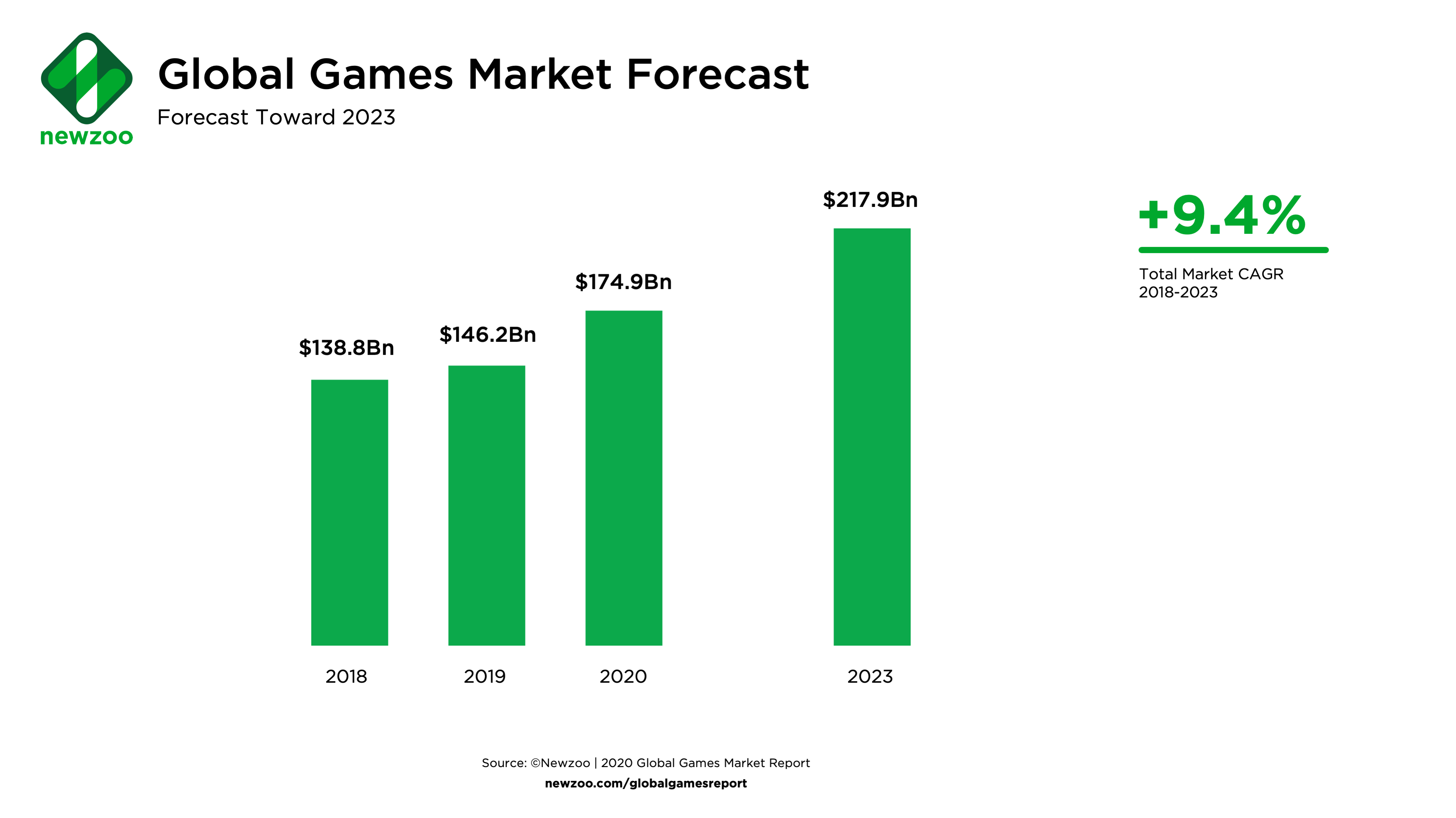 同样是Newzoo的统计,2020年全球游戏市场收入将达1749亿美元,其中PC游戏收入374亿美元,移动游戏收入863亿美元,游戏主机收入512亿美元。而到2023年,全球游戏市场收入将达到2180亿美元。